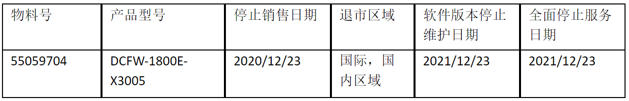 北京365英国上市公司数码云科信息技术有限公司正式通知您, 以上DCFW-1800E-X3005下一代防火墙(55059704)将于2020年12月23号停止接收新的订单(具体日期见上表),不再供货。给您带来的不便,敬请原谅。