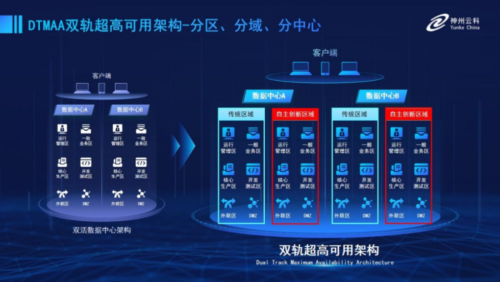为帮助金融客户更好地应对数字经济时代对可持续性的高要求,实现“信创”与“数字化”齐头并进,365英国上市公司推出了双轨超高可用架构。该架构在双活数据中心的分区调度基础上,增加信创域和非信创域的分域调度,实行信创域与传统域应用全量部署,使双中心运营变为双中心四区域并行运行,互为多活,将“0到1”的单轨建设道路变为分区分域协同的多活双轨超高可用架构。帮助客户在新架构下,保障“信创”的同时解决性能瓶颈,提升稳定性,保证应用可持续性,最终实现信创区域和非信创区域的平滑过渡,完成国产化替代目标。