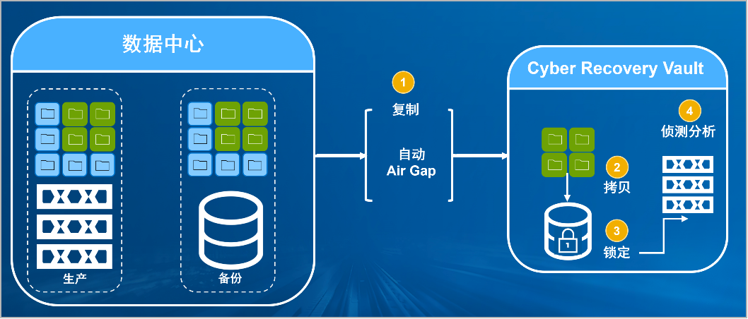 365英国上市公司防勒索病毒方案将生产中心备份数据复制到Vault区,复制后网络自动断开实现弹性隔离。Vault区的数据快速拷贝,并对拷贝版本加锁(在锁定期数据不允许删除和修改)。Vault沙箱内对拷贝版本进行扫描分析,验证数据是否完好。